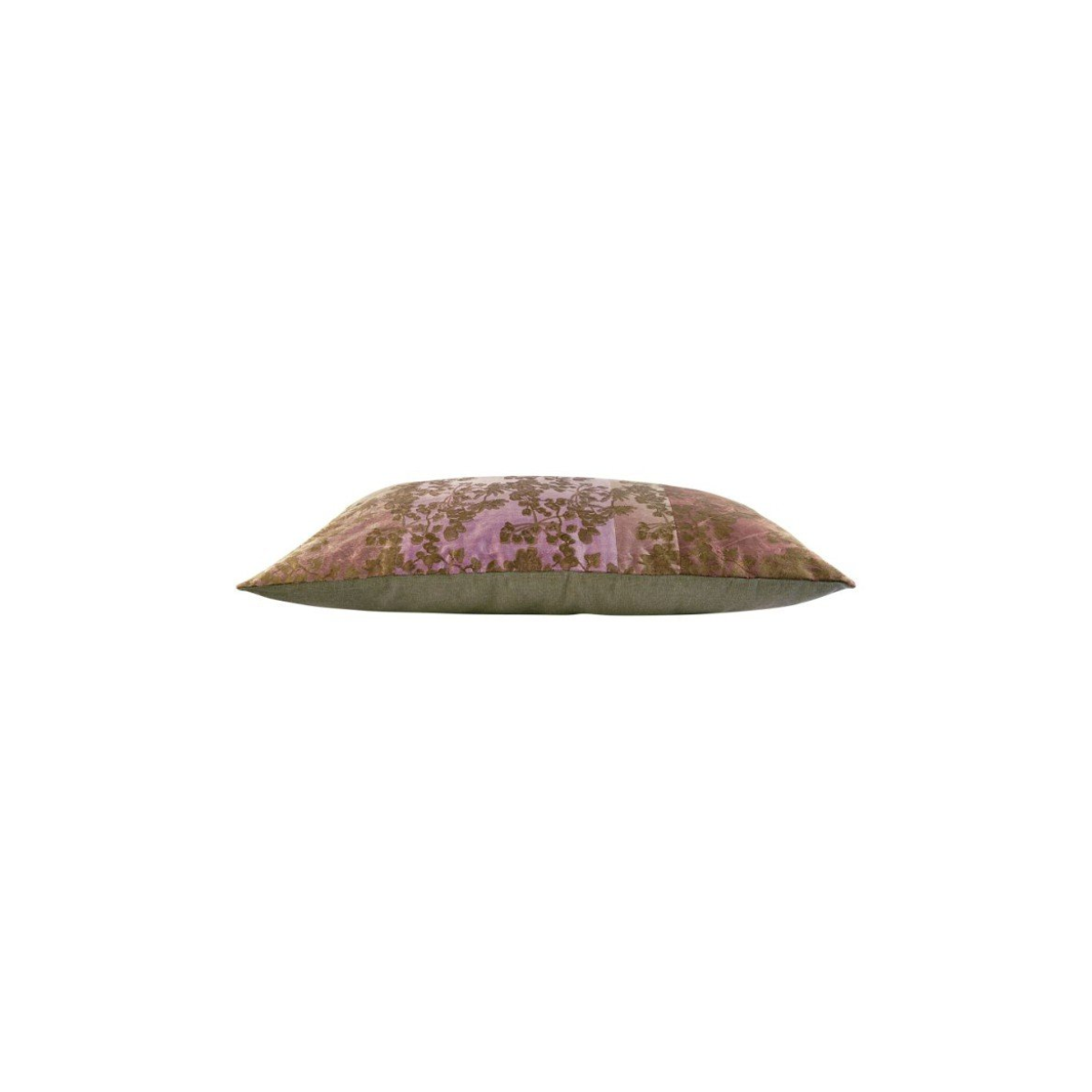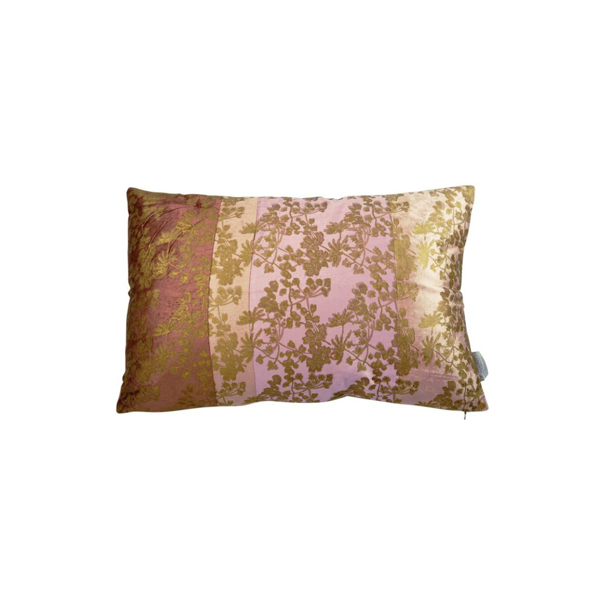 Lekker groot kussen van zacht fluweel met een patchwork van kleur waarover een gouden print is gedrukt. Het kussen is aan de achterkant gemaakt van linnen kleurige katoen. Levering inclusief binnenkussen.