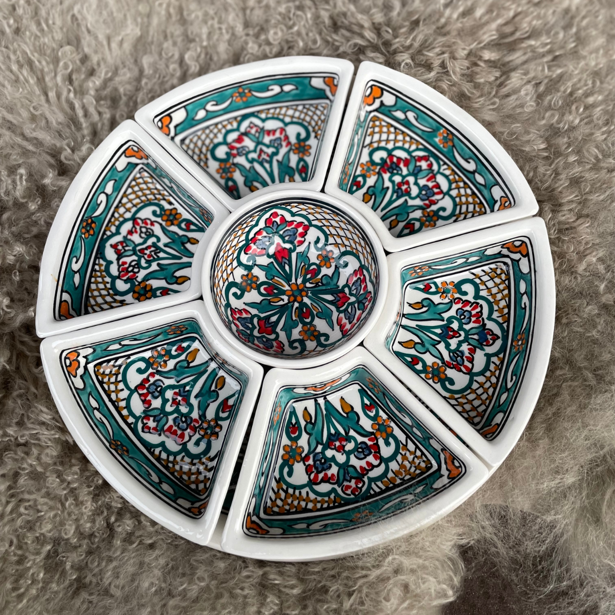Deze prachtige met de hand gemaakt en beschilderde Tapas set is perfect om heerlijke tapas en andere gerechten in te serveren. Met het gebloemde Tunesische motief creëer je direct een Mediterraanse sfeer aan tafel.