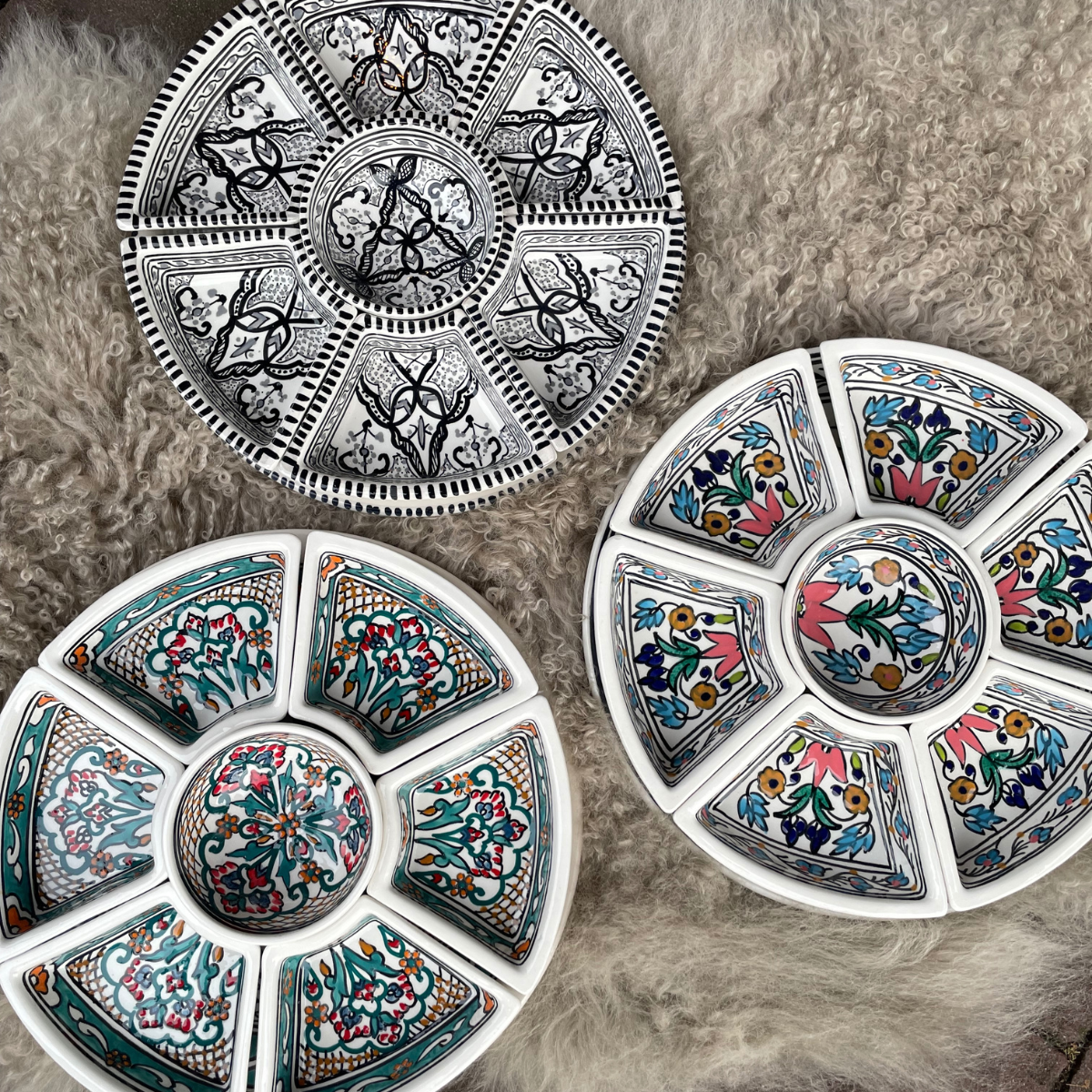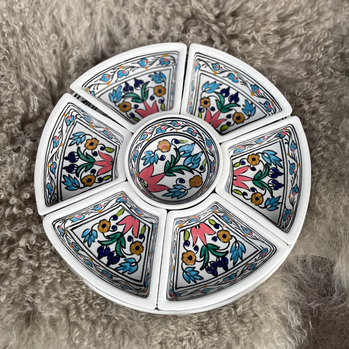 Deze prachtige met de hand gemaakt en beschilderde Tapas set is perfect om heerlijke tapas en andere gerechten in te serveren. Met het gebloemde Tunesische motief creëer je direct een Mediterraanse sfeer aan tafel.