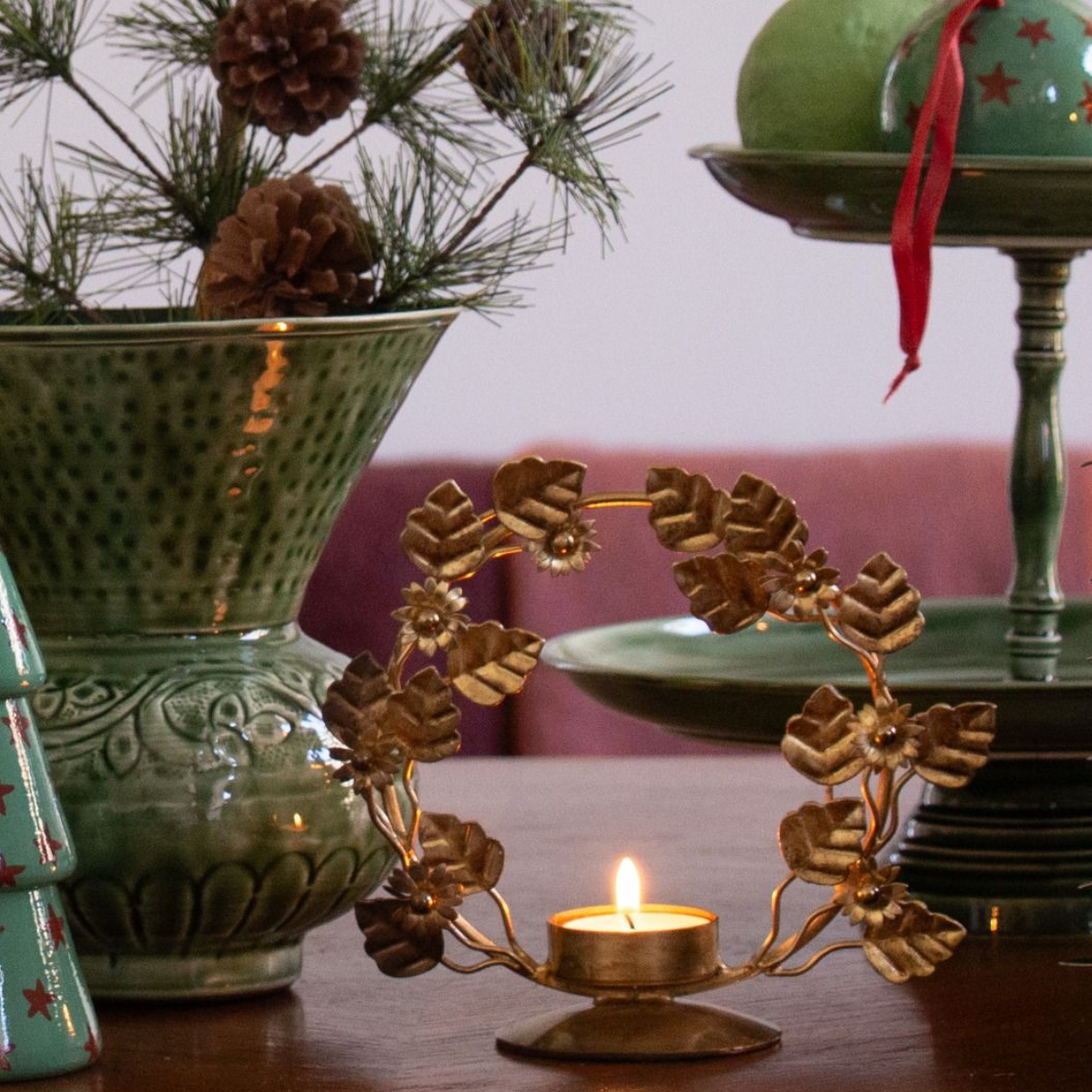 Schitterend middelpunt voor je kersttafel. Deze elegante kandelaar met een boog van fijne bladeren laat het kaarslicht prachtig weerkaatsen. Het zorgt voor een warme gloed en een vleugje magie in huis. Een blikvanger die sfeer en gezelligheid brengt – zeker met de feestdagen.